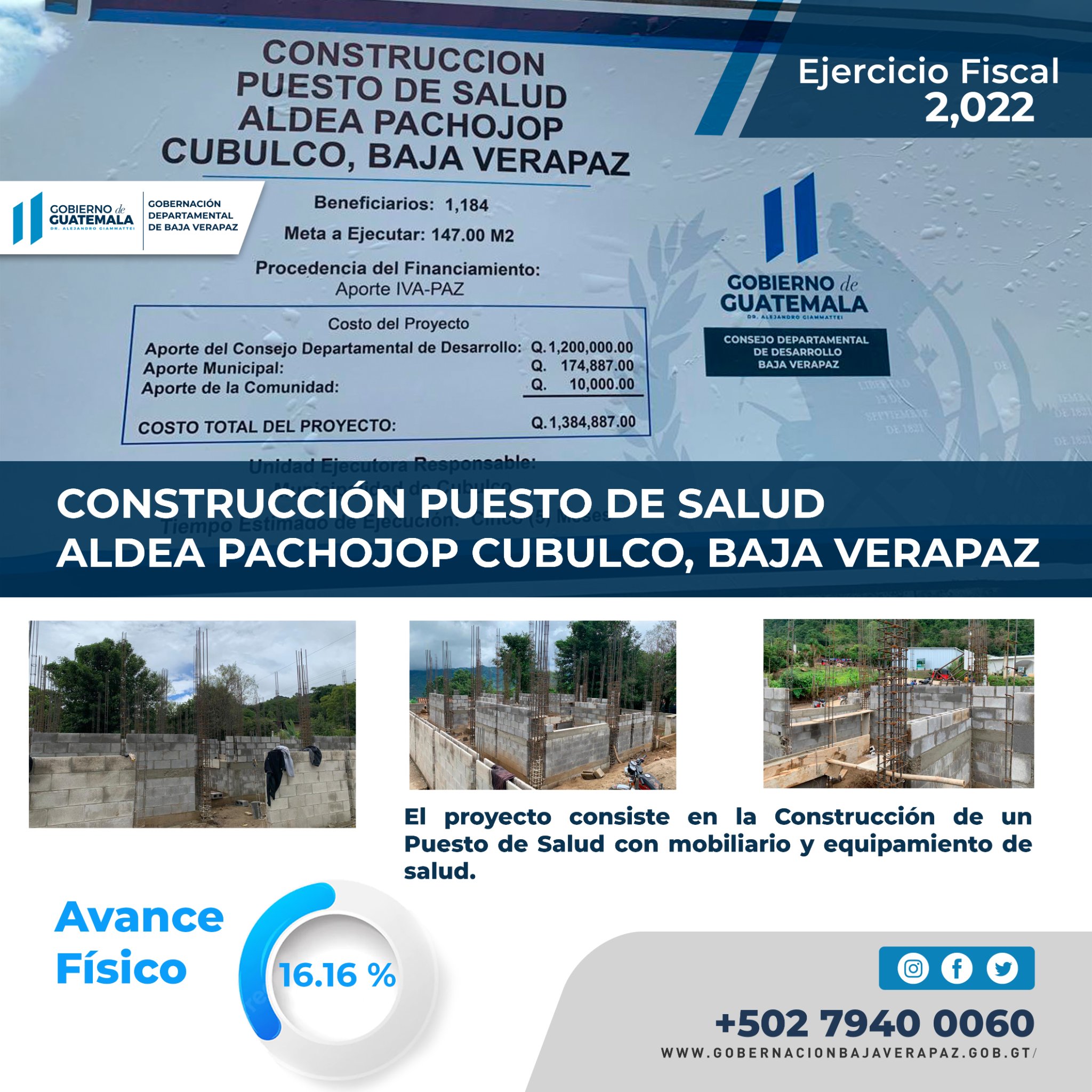 #GuateAvanza Proyecto de Construcción Puesto De Salud, Aldea Pachojop Cubulco, Baja Verapaz, impulsado por el Presidente Dr. Alejandro Giammattei, como parte de la Política General del Gobierno, se da a conocer el avance de proyecto que se ejecutan en el ejercicio fiscal 2022, con fondos provenientes del Gobierno Central de los Aportes a los Consejos Departamentales de Desarrollo, Aporte de la comunidad y Municipalidad de Cubulco.