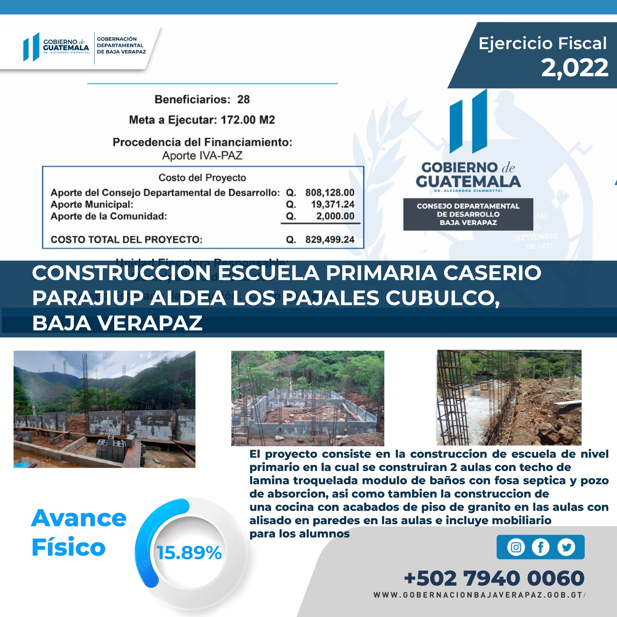 #GuateAvanza Proyecto de Construcción Escuela primaria Caserío Parajiup Aldea los Pajales cubulco, Baja Verapaz, impulsado por el Presidente Dr. Alejandro Giammattei, como parte de la Política General del Gobierno, se da a conocer el avance de proyecto que se ejecutan en el ejercicio fiscal 2022, el proyecto consiste en la construcción de escuela de nivel primario en la cual se construirán 2 aulas con techo de lámina troquelada módulo de baños con fosa séptica y pozo de absorción así como también la construcción de una cocina con acabados de piso de granito en las aulas con alisado en paredes en las aulas e incluye mobiliario para los alumnos, financiado con fondos provenientes del Gobierno Central de los Aportes a los Consejos Departamentales de Desarrollo, Aporte de la comunidad y Municipalidad de Cubulco Baja Verapaz.